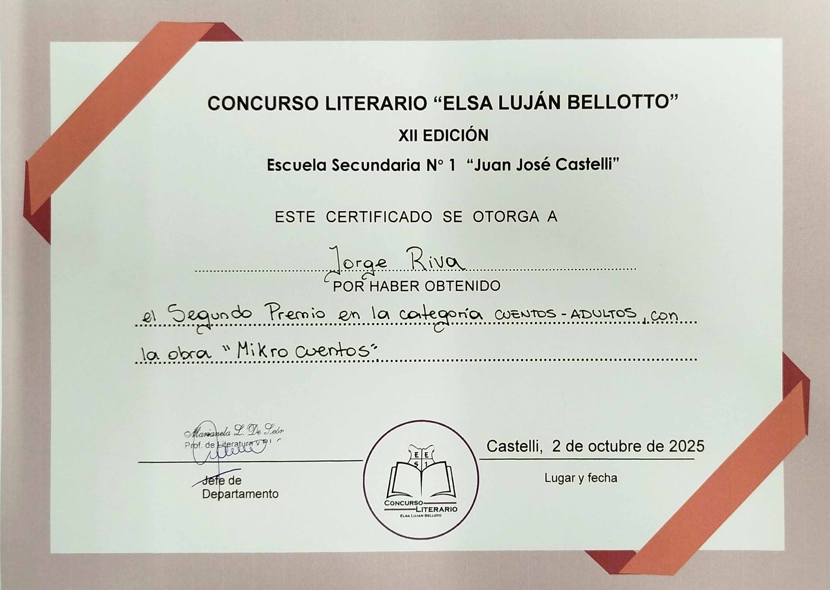 Disciplina: literatura Obra: mikroCuentos Fuente: Concurso Elsa Belloto Descripción: Segundo premio para mikroCuentos